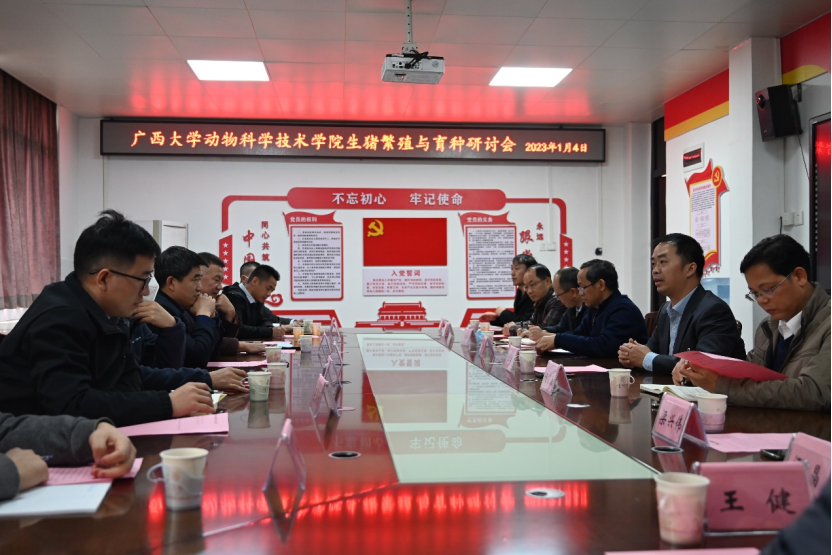 2023年1月4日,新年伊始,在beat365302会议室举办了“2022生物资源保护与利用国际产学研用合作会议”的主题研讨会“生猪繁殖与育种研讨会”。参加研讨会人员有公司领导陆阳清常务副经理、何家康副经理、韦祖樟副经理及骨干教师,河南守望之境科技有限公司创始人刘洪波博士,区内养猪企业育种主要负责人赵云翔、司景磊、何昭友等,大家围绕生猪繁殖与育种主题,分别从繁殖育种、饲料营养、疫病防控、生产管理角度展开了热烈讨论。