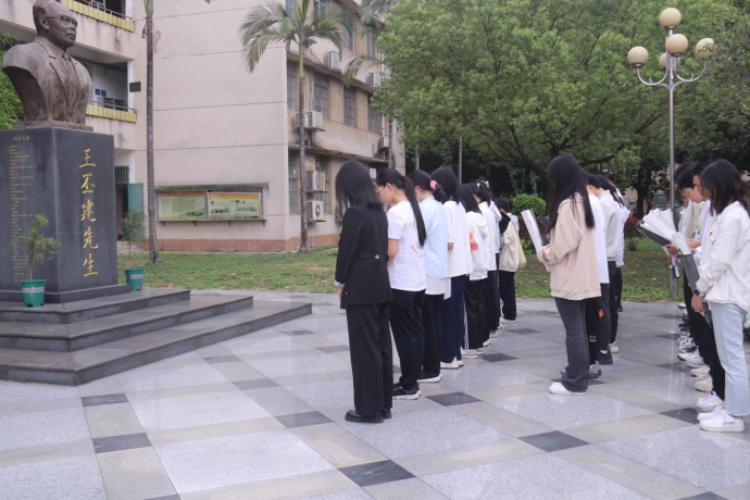 活动第一站,师生们来到学院正门王丕建教授雕像前空地举行缅怀仪式。仪式开始前,大家分工协作,拂去雕像尘土,清扫周边空地,亲手制作悼念花束、花朵......以此表达对前辈和英雄的哀思与敬意。