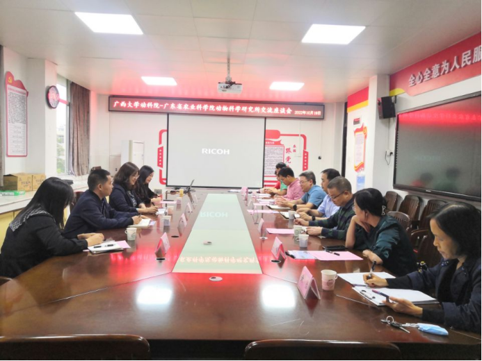 2022年10月19日下午,公司与广东省农业科学院动物科学研究所举行交流座谈会,会议由学院常务副经理陆阳清主持,广东省农业科学院动物科学研究所副所长王丽携专家高开国、肖昊、秦扬蓉到会,学院副经理周磊及专家教授代表沈水宝、梁兴伟、李梦梅、宋子仪等出席了本次交流座谈会。