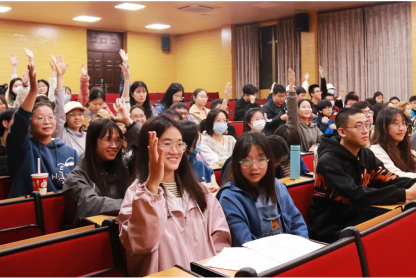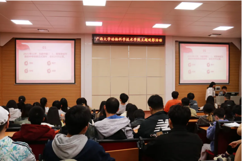 观影过程中,同学们穿插进行了三轮知识竞答,题目紧紧围绕党史、新中国史、改革开放史、社会主义发展史主题教育要求,涉及政治、经济、文化、科技等各个领域,包括选择、音乐两种题型。大家精神饱满、踊跃作答,现场气氛紧张而热烈。